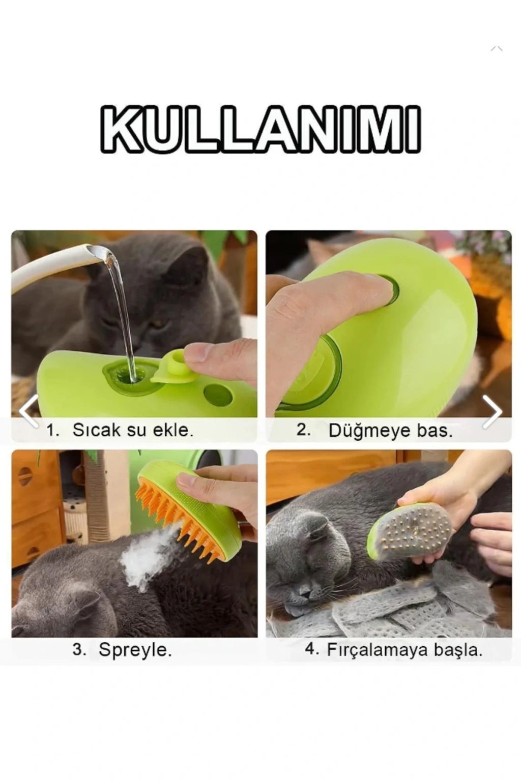 Yenilikçi Buharlı Kedi Fırçamız, tüm evcil hayvan bakım sorunlarınızı tek bir kullanışlı araçla çözer: tüy dökme, buharlı temizleme ve masaj.