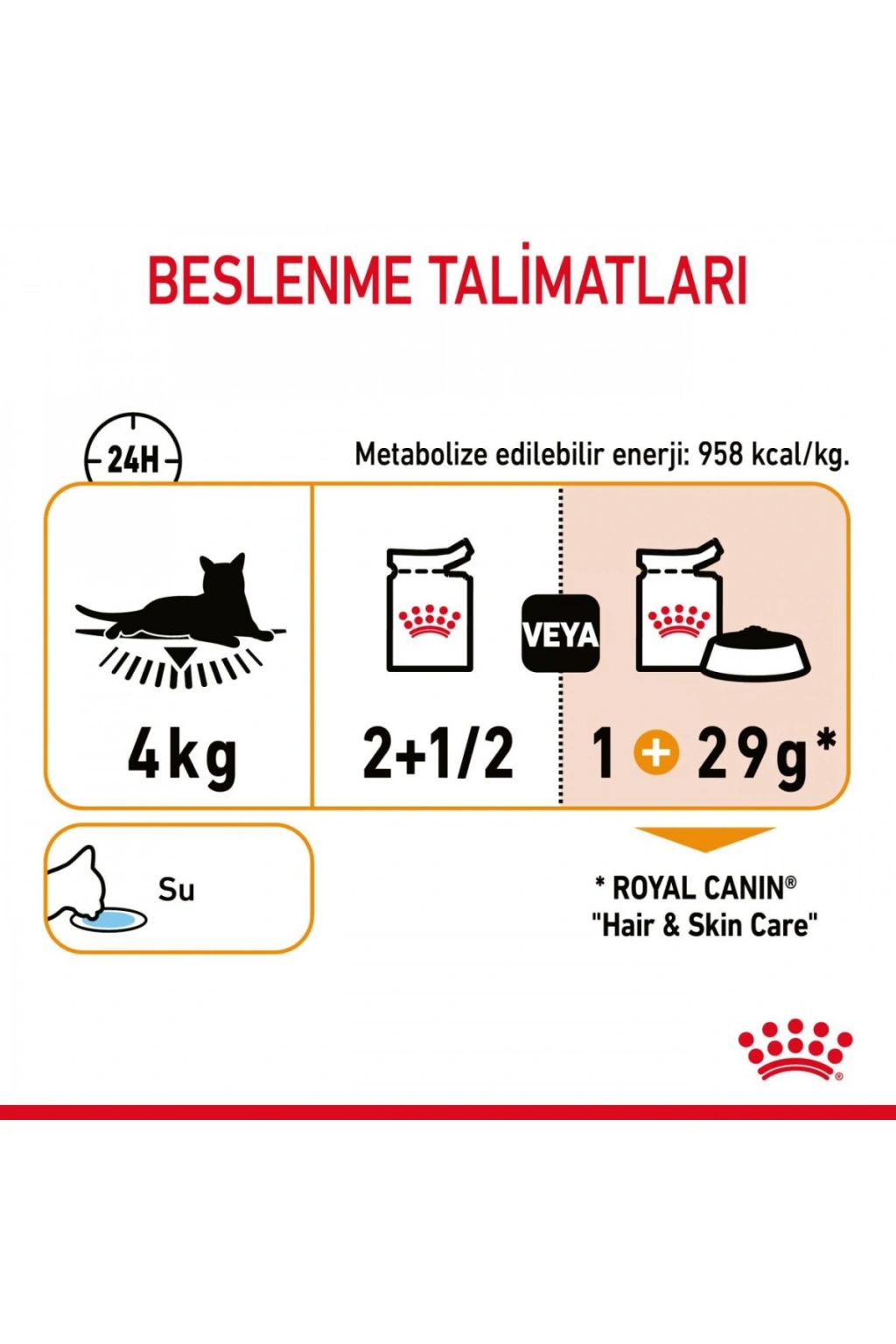 KANITLANMIŞ SONUÇLAR Kedi Sahiplerinin %90'ından fazlası 3 Hafta Sonra daha iyi bir deri ve tüy kalitesi gözlemledi.; Kedinizin kaşınan bir derisi ve sağlıksız bir tüy yapısı mı var? Kedinizin derisinin ve tüylerinin genel durumu onun genel sağlığının iyi bir göstergesidir.; Sağlıklı bir tüy parlak ve pürüzsüz olmalıdır.; Çok fazla bakım yapmak veya kaşımak derisine zarar verebilir ve koruyucu deri bariyerini bozabilir.; Bu formül onun güzel derisini ve tüylerini içten dışa doğru besler.; YARARLARI ROYAL CANIN® HAIR&SKIN CARE kedinizin deri sağlığını desteklemek ve tüylerinin dolgun, sağlıklı ve parlak olmasını sağlamak için formüle edilmiştir.; Derisini desteklemeye ve beslemeye yardımcı olmak için bu formül, GLA, EPA ve DHA dahil olmak üzere omega-3 ve omega-6 yağ asitlerini içerir.; DERİ VE TÜY BAKIM PROGRAMI 1. Bu kuru mama formülünün mükemmel tamamlayıcısı olan ROYAL CANIN® HAIR&SKIN CARE yaş mamasını deneyin.; 2. Kedinizin yatağını ve en sevdiği dinlenme yerlerini temiz tutarak derisinin korunmasına yardımcı olabilirsiniz.; Bu, kaşıntılı parazitlerin üreme alanı olan toz ve kepeklerin giderilmesine yardımcı olur.; 3. Fazla tüyleri gidermek için kedinizi düzenli olarak tarayın ve bakım yaparken daima kedi dostu ürünler kullanın.; 4. Kedinizin sağlığıyla ilgili herhangi bir sorunuz veya endişeniz varsa lütfen veteriner hekiminizle iletişime geçin.; KOMPOZİSYON: et ve hayvansal türevler, bitkisel protein ekstraktları, tahıllar, bitkisel ve hayvansal yağlar, bitkisel orijinli türevler, mineraller, mayalar.; BESLENME TALİMATI: Tabloya bakınız.; Parti kodu, tescil numarası ve son kullanma tarihi için, ambalajin üzerine bakınız.; Serin ve kuru bir yerde saklayınız.; Royal Canin Turkey Evcil Hayvan Ürünleri Ticaret Limited Şirkaeti tarafından ithal edilmiştir.; İLAVELER (her kg için): Beslenmeye dayalı ilaveler: Vitamin D3 (3a671): 90 IU, Demir (3b103): 12 mg, İyot (3b202): 0.3 mg, Bakır (3b405, 3b406): 2.4 mg, Manganez (3b502, 3b503, 3b504): 3.8 mg, Çinko (3b603, 3b605, 3b606): 38 mg -