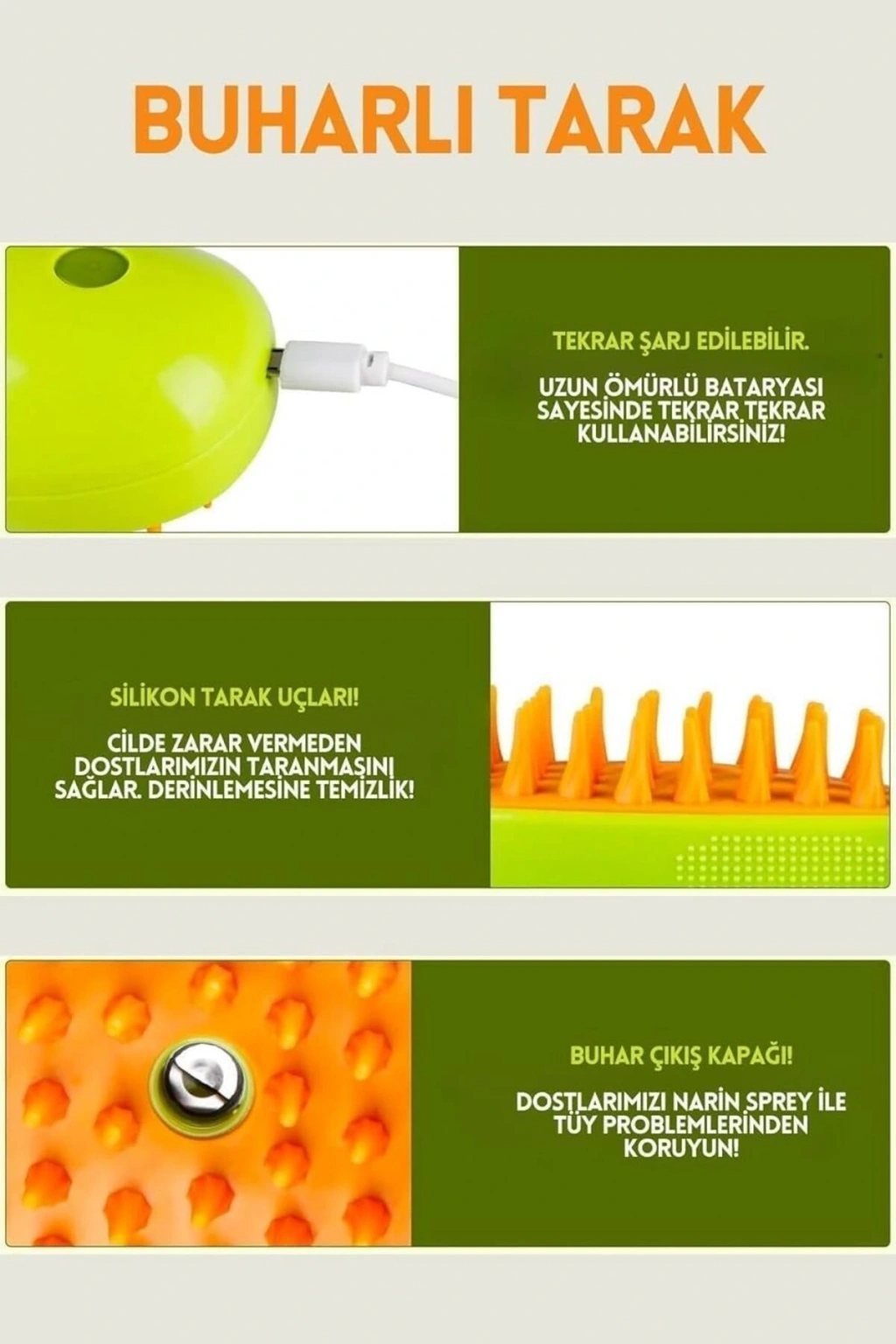 - Yüksek kaliteli malzemelerden üretilmiş, dayanıklı ve uzun ömürlü kullanım sunar.; - Buharlı teknoloji sayesinde kedinizin veya köpeğinizin tüylerini nazikçe temizlerken aynı zamanda derinlemesine bakım sağlar.; - Kolay taşınabilir tasarımı ile evde veya seyahat sırasında rahatlıkla kullanılabilir; her yerde pratik bir çözüm sunar.; - Çevre dostu yapısıyla çevre üzerindeki etkisini minimize ederken, hayvan dostu bir bakım deneyimi yaşatır.