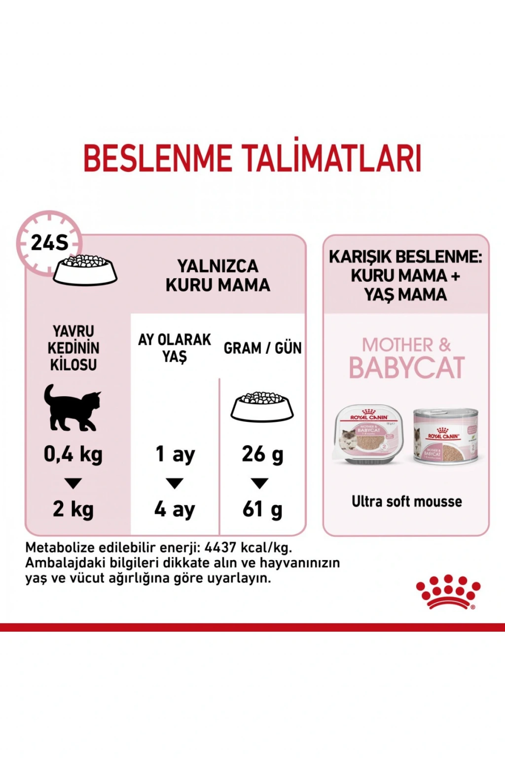 ROYAL CANIN® Mother & Babycat gebelik döneminde ve emzirme döneminde kedinizin yüksek enerji ihtiyaçlarını karşılamak için özel olarak hazırlanmıştır.; Ayrıca anne sütüyle beslenen ve 4 aya kadar olan yavru kedilerin sağlıklı gelişmelerini desteklemek için formüle edilmiştir.; Sağlıklı bağışıklık sistemi gelişimini desteklemek için Vitamin C ve E de dahil olmak üzere etkisi kanıtlanmış besin öğeleri içerir.; Bu formül, yavru kedilerin beyin gelişimini ve göz sağlığını desteklemek için Omega-3 yağ asitleriyle (DHA) zenginleştirilmiştir.; Faydalı prebiyotiklerin (MOS) ve çok yüksek sindirilebilirliği olan proteinlerin birleşimi sayesinde, ROYAL CANIN® Mother & Babycat aynı zamanda sindirim sağlığı açısından bağırsak mikrobiyotasının () sağlıklı dengesini desteklemeye yardımcı olur.; ROYAL CANIN® Mother & Babycat’in taneleri suyla kolaylıkla ıslatılabilir ve böylelikle sütten kesilen yavru kedilerin su alımını desteklemek için ideal olan iştah artırıcı bir lapa kıvamı elde edilebilir.; 16 hafta gibi kısa bir süre içerisinde, yavru kedileriniz bir sonraki büyüme evresinde beslenme gereksinimlerini karşılamak için özel olarak geliştirilen bir diyete ihtiyaç duyacaklar.; Bu aşamada, yavru kediler için ROYAL CANIN® KITTEN formüllerine geçebilirsiniz.; Yavru kedi formülleri, kuru mama ya da katı kıvamda ezme, soslu veya jöle kıvamında yaş mama formunda satışa sunulmaktadır.; Onaylanmış Formül %96 yetiştirici memnuniyeti.; (*2020 ve 2021 yıllarında gerçekleştirilen bir yetiştirici onay anketine dayanmaktadır.; ) Özellikler Doğal antidoksidanlar içerir.; Yapay renklendiriciler içermez.; Yapay tatlandırıcılar içermez.; Mother & Babycat’in Sağlık Desteği MOTHER & BABYCAT anne kedilerin gebelik ve laktasyon dönemlerindeki özel ihtiyaçlarını ve birinci büyüme dönemindeki yavru kedilerin özel ihtiyaçlarını karşılayacak şekilde formüle edilmiştir.; Güçlü Bağışıklık Sistemi Etkinliği bilimsel olarak kanıtlanmış, E ve C vitaminleri de içeren özel kompleks sayesinde yavru kedilerin bağışıklık sistemlerini destekler.; Beyin Gelişimi Omega 3 yağ asitleri (DHA) ile zenginleştirilmiş bu formül, yavru kedilerin beyin gelişimini ve sağlıklı görme fonksiyonlarını da destekler.; Mikrobiyom Desteği Prebiyotik (MOS) kombinasyonu & yüksek sindirilebilirlikli proteinler sayesinde sağlıklı bağırsak mikrobiyotasını ve sindirim sağlığını destekler.; KOMPOZİSYON: Kurutulmuş kümes hayvanları proteinleri, hayvansal yağlar, mısır unu, buğday gluten*, pirinç, hidrolize hayvansal proteinler, maya ürünleri, pancar küspesi, bitkisel lifler, soya yağı, mineraller, balık yağı, frukto-oligo-sakkaritler, hidrolize maya (manno-oligo-sakkarit ve beta-glukan kaynağı) (%0,30), alg yağı Schizochytrium sp.; (DHA kaynağı), kadife çiçeği unu (lutein kaynağı).; BESLENME TALİMATI: Tabloya bakınız.; Parti kodu, tescil numarası ve son kullanma tarihi için, ambalajin üzerine bakınız.; Serin ve kuru bir yerde saklayınız.; Royal Canin Turkey Evcil Hayvan Ürünleri Ticaret Limited Şirketi tarafından ithal edilmiştir.; İLAVELER (her kg için): Beslenmeye dayalı ilaveler: Vitamin A: 25500 IU, Vitamin D3: 1000 IU, Demir (3b103): 33 mg, İyot (3b201, 3b202): 3,3 mg, Bakır (3b405, 3b406): 10 mg, Manganez (3b502, 3b504): 43 mg, Çinko (3b603, 3b605, 3b606): 130 mg, Selenyum (3b801, 3b811, 3b812): 0,04 mg - Teknolojik ilaveler: Sedimanter kökenli klinoptilolit: 5 g - Koruyucular - Antioksidanlar.; *L.; I.; P.; : Çok yüksek sindirilebilirlik özelliğinden dolayı seçilmiş protein.
