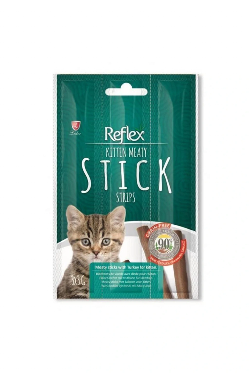 Reflex Stick Hindili Yavru Kedi Ödül Çubukları 3x3 Gr İçerik; Et ve Hayvansal Ürünler (hindi %93) mineraller Analatik Bileşenler; Ham protein %36, Yağ içeriği %23, Ham kül %8,5, ham lif %1,5, nem %27 Besin Katkıları; Vitamin D3 500, IU Vitamin E 5mg, Taurin 1000 mg Beslenme Önerileri;4 aylıktan büyük yavru kedilere günde yarım veya 1 adet önerilir (yavru kedinin vücut ağırlığı ve aktivizmine göre hesaplanır.; Taze içme suyunu sürekli bulundurun.; Tekli paketleri açınca.; Aynı günde tüketin.