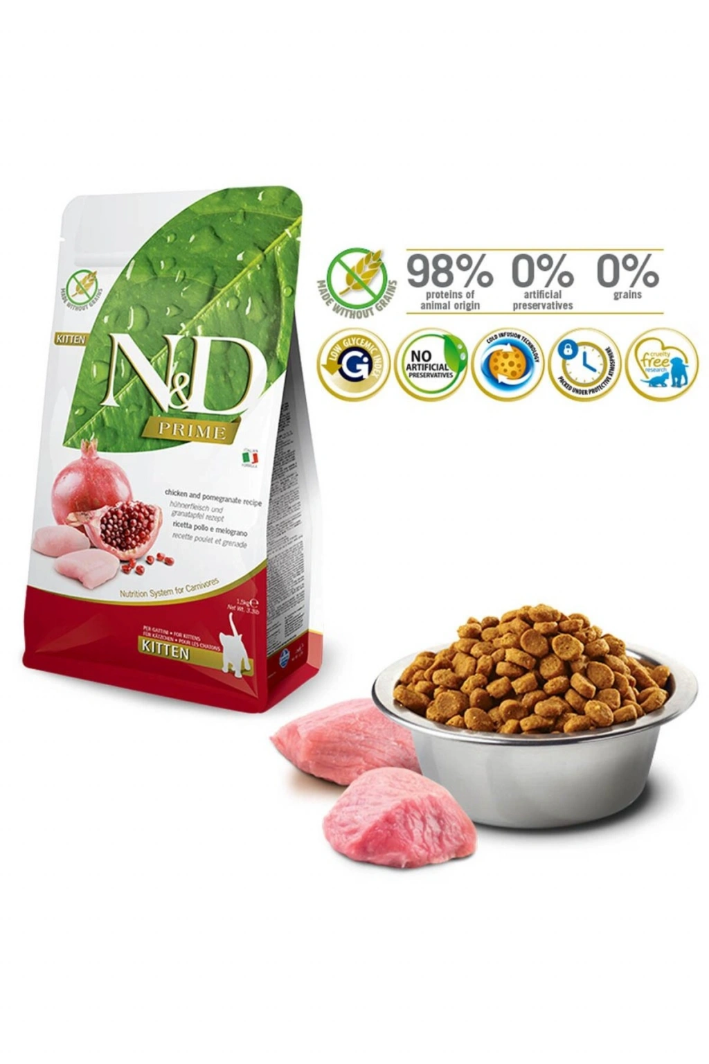 N&D Prime Kitten Tavuklu Narlı Tahılsız Yavru Kedi Maması 1,5 Kg Tavuk ve nar.; Yavru kediler, gebe ve emzirme dönemindeki yetişkin kediler için formüle edilmiş tam mamadır.; BİLEŞİMİ Kemiksiz tavuk (%30), kurutulmuş tavuk proteini (%28), tatlı patates, tavuk yağı, kurutulmuş yumurta, ringa balığı, kurutulmuş ringa balığı proteini, balık yağı (ringa balığı), bezelye lifi, kurutulmuş havuç, yonca, inulin, fruktooligosakkarit, maya ekstratı (mannooligosakkarit kaynağı), kurutulmuş nar (%0.5), kurutulmuş elma, kurutulmuş ıspanak, fisilyum kabukları ve tohumları (%0.3), kurutulmuş tatlı portakal, kurutulmuş yaban mersini, sodyum klorür, kurutulmuş bira mayası, zerdeçal (%0.2), aloe vera ekstraktı.; KG'DAKI İLAVELER Besinsel katkı maddeleri: A Vitamini 18000IU; D3 Vitamini 1200IU; E Vitamini 600mg; C Vitamini 300mg; Niasin 150mg; kalsiyum D-pantotenat 50mg; B2 Vitamini 20mg; B6 Vitamini 8.1mg; B1 Vitamini 10mg; biyotin 1.5mg; Folik asit 1.5mg; B12 Vitamini 0.1mg; kolin klorür 2500mg; Beta‐karoten 1.5mg; Çinko (metiyonin hidroksi analoğunun çinko şelatı): 163.8mg; Mangenez (metiyonin hidroksi analoğunun mangan şelatı): 64.6mg; Demir ( glisin hidratın demir (II) şelatı): 58.3mg; Bakır (metiyonin hidroksi analoğunun bakır şelatı) 15.8mg; Teknik olarak saf DL‐metiyonin 5000mg; Taurin 4000mg; L‐Karnitin 300mg.; Organoleptik katkı maddeleri: yeşil çay ekstraktı 100mg; biberiye ekstraktı.; Antioksidanlar: bitkisel yağlardan gelen tokoferol.; ANALİTİK BİLEŞENLER Ham protein %44.00; Ham yağ %20.00; Ham lif% 1.80; Nem %8.00; Ham kül %8.50; Kalsiyum %1.10; Fosfor %0.90; Magnezyum %0.08; Omega‐6 %3.30; Omega‐3 %0.90; DHA %0.50; EPA %0.30. ENERJİ DEĞERİ EM Kcal/Kg 4204 - Mj/Kg 17,59 MAMA TANESİ RENK BİLDİRİMİ Bazen -sadece doğal malzemeler kullandığımız için- farklı üretim partilerinde gıdanın dış görünümü değişebilir ya da mama tanelerinin renklerinde değişkenlik olabilir.; Aynı protein kaynağı et -daha koyu ya da daha açık- farklı renk tonunda olabilir.; Bu durum mama tanesinin rengine de yansır.; Farmina, farklı partileri tek tip haline getirmek için herhangi bir yapay renklendirici kullanmaz.; Bu nedenle, mama tanelerinde farklı renk tonlarının oluşması normaldir ve mamanın kalitesini veya besinsel özelliklerini etkilemez.; Daha fazla açıklamaya mı ihtiyacınız var Genius Danışmanınızla iletişime geçin.; MAMA TANE BOYUTU Mama taneleri, mamanın doğru bir şekilde parçalanmasını sağlamak için bir boyut aralığına sahiptir.; Nadir olarak bazen aynı paket içinde minimal varyasyonlar olabilir.; Mama taneleri kontrol aralığında olduğu sürece her şey normaldir.; Belirtilen aralıkların dışında bazı mama taneleri fark ederseniz, %100 Garanti politikasından yararlanabileceğiniz için lütfen Genius Danışmanınızla iletişime geçin.; YAVRU KEDİ: Çap 5-7 mm - Kalınlık: 4-5 mm YETİŞKİN KEDİ: Çap 8-10 mm - Kalınlık 3.5-5.5 mm Marka: ND Menşei Sırbistan Firma/Satıcı Bilgisi Şentürkler Veterinerlik Hizmetleri San.; Tic.; Ltd.; Şti.; Üretici Bilgisi: İthalatçı/Yetkili Temsilci/İfa Hizmet Sağlayıcı: Farmina Turkey Pet Ürünleri Anonim Şirketi İletişim: turkey@farmina.; com